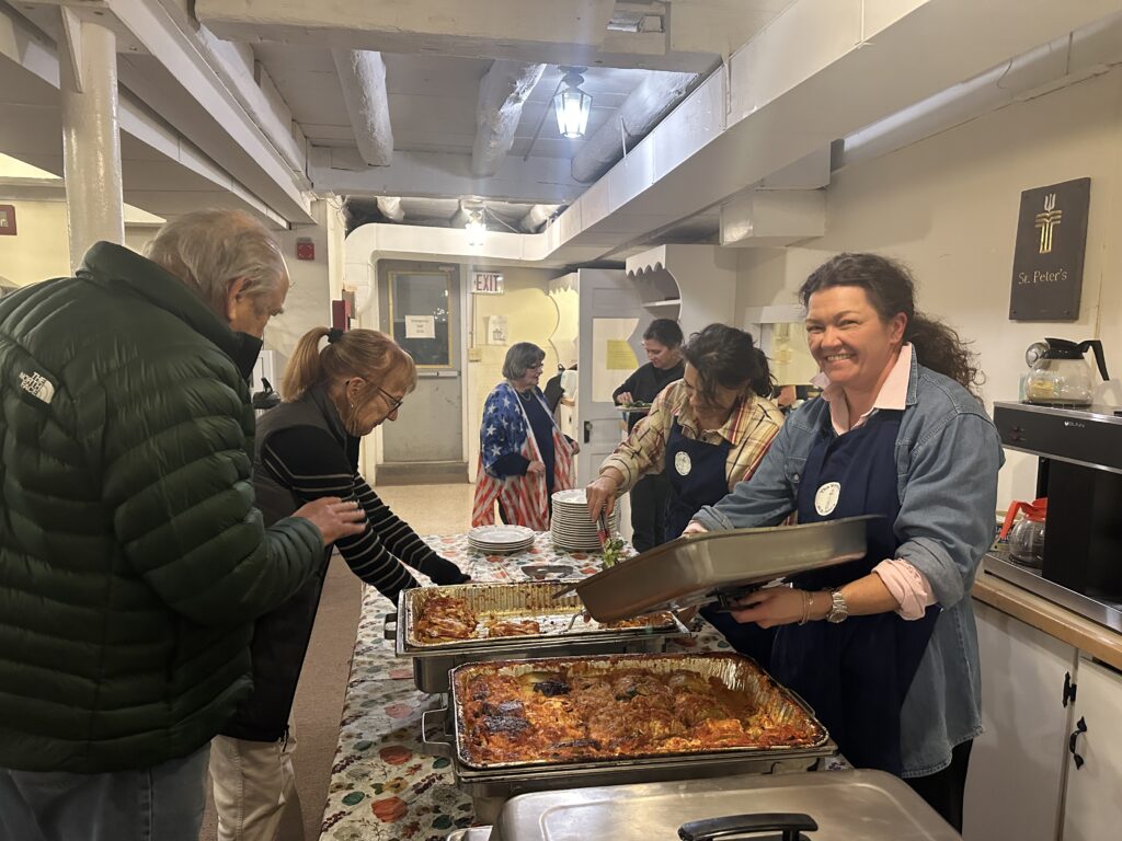 Election Day Dinner 2025 Pictured serving are Suzie Eckhart and Vanessa Villanova, with Kathy Geddie and Jennifer Thompson in the background and receiving the delicious meal are Laura and Steve Coursin. Skip back to main navigation